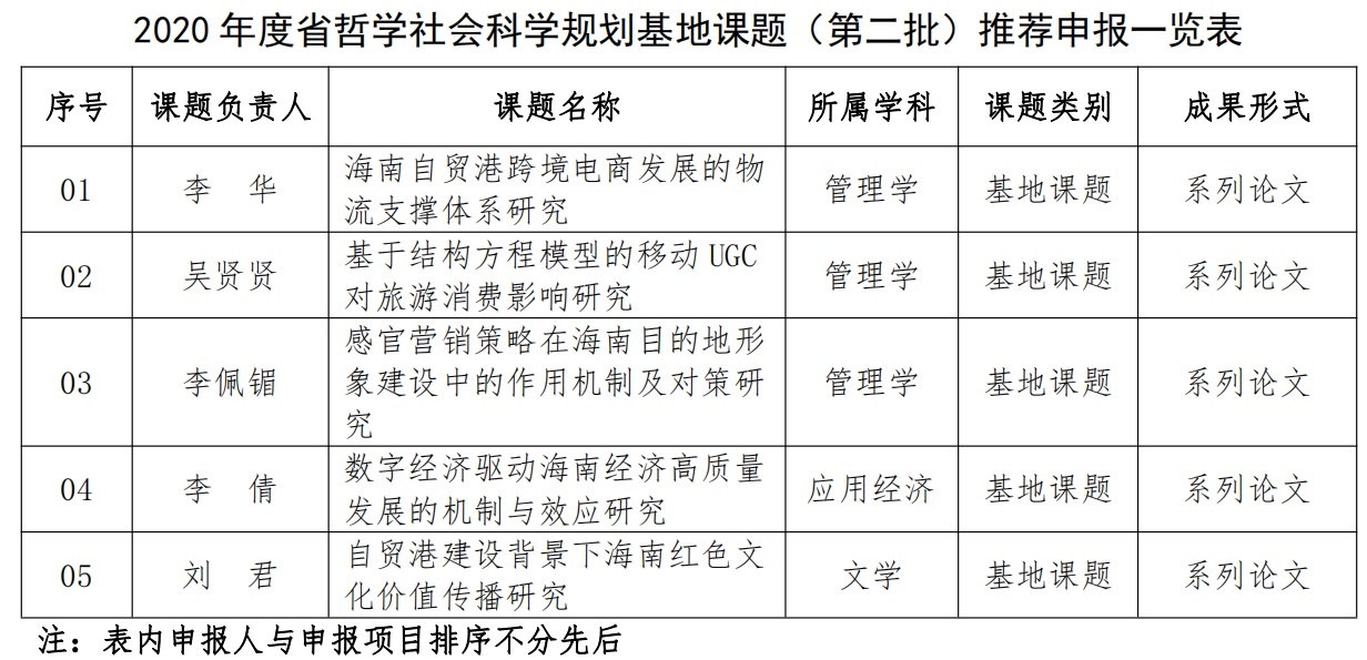 根据课题申报要求,基地于2020年10月30日,聘请海南大学、海南师范大学、海南省委党校的社科专家进行了推荐评审。各位专家根据“主要考察选题的学术价值或应用价值,对省内外研究状况的总体把握程度”“主要考察研究内容、基本观点、研究思路、研究方法和创新之处”“主要考察课题负责人的前期相关研究成果和主要参考文献”等标准要求,对每项课题进行严格评审、逐项打分,经统计遴选出李华主持的“海南自贸港跨境电商发展的物流支撑体系研究”等5项课题,拟向省社科联推荐申报,并向全院教师公示。公示期2天。公示期间,如对公示项目有异议,请以书面方式实名向我基地办公室或学院纪检监察处反映。