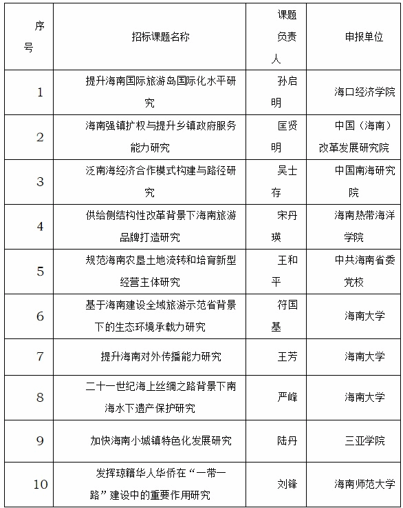 海南国际旅游岛智库联盟2017年招标课题立项名单公示