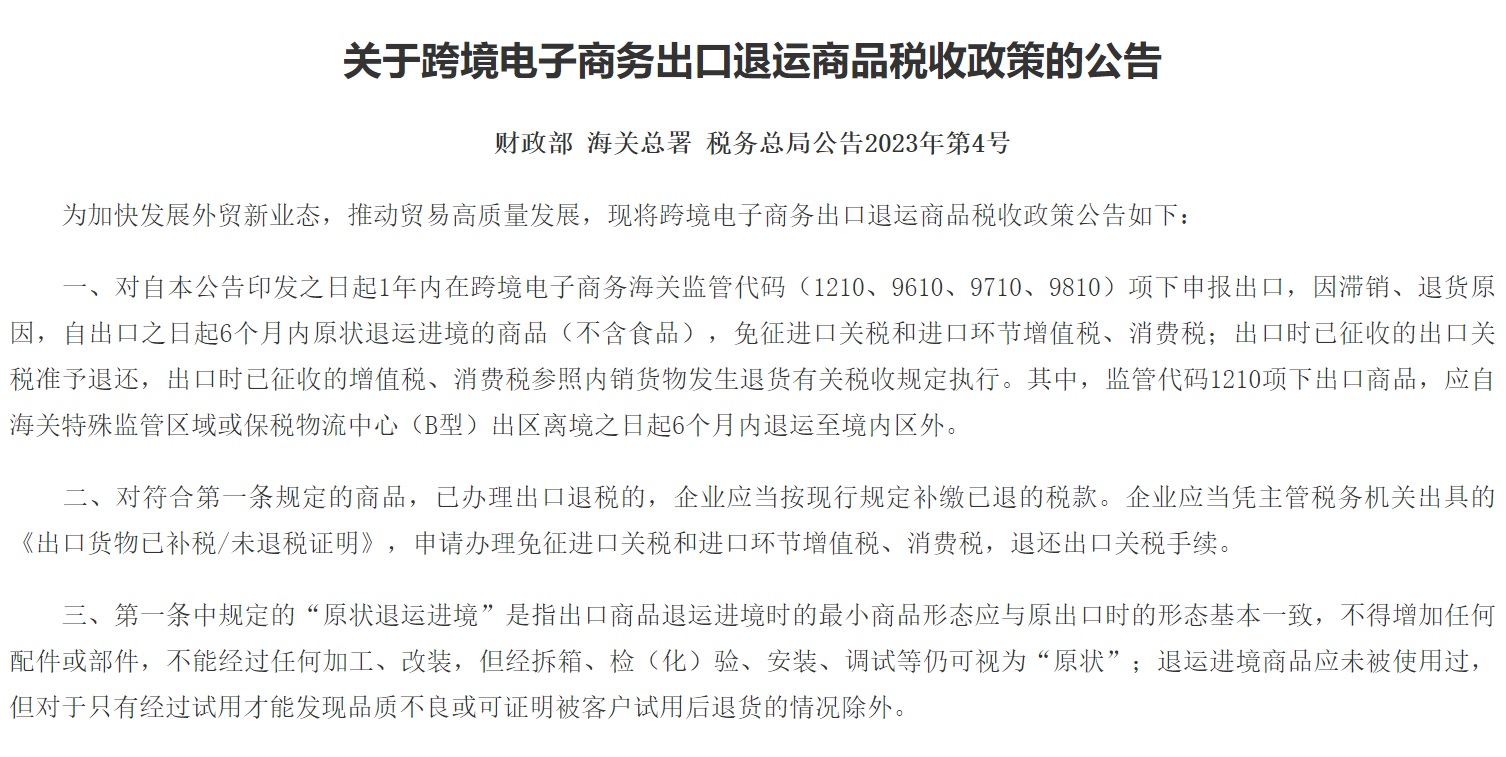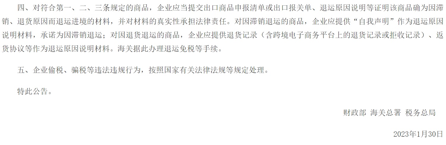 财政部、海关总署、税务总局联合发布《关于跨境电子商务出口退运商品税收政策的公告》