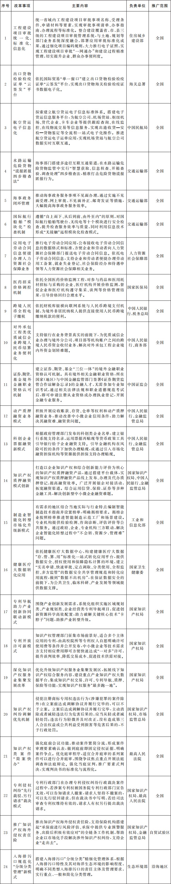 (一)在全国范围内复制推广的改革事项。