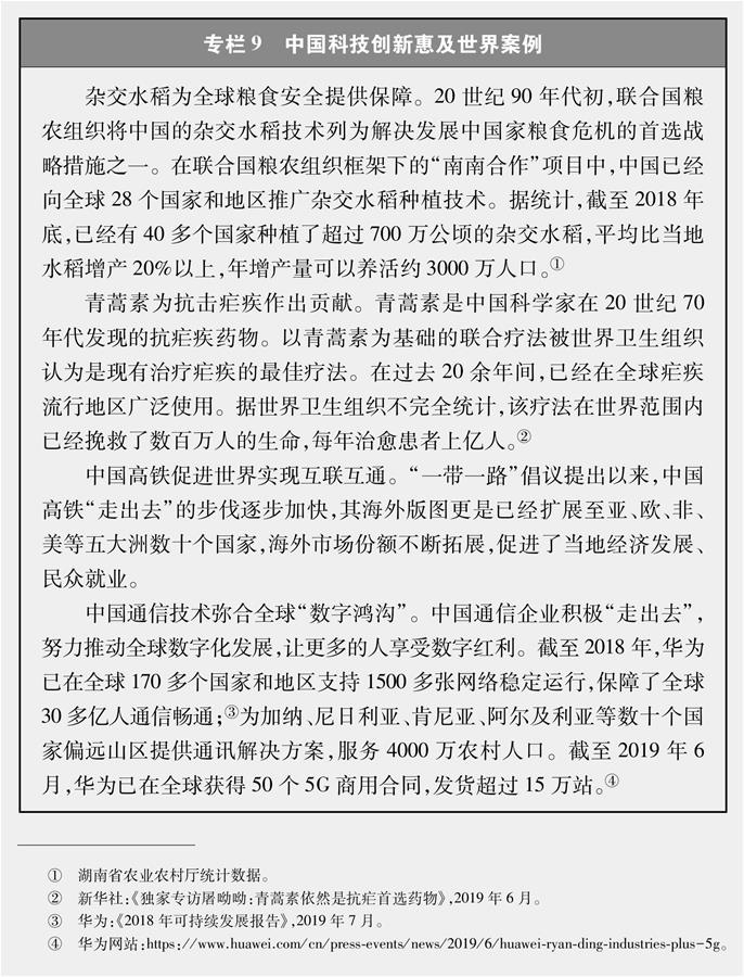 中国科技创新为世界经济增长注入新动能。近年来,中国科技领域投入不断增加,重大科技创新成果不断涌现。2018年,中国研发支出占GDP的比重为2.19%。世界知识产权组织等发布的全球创新指数显示,2019年,中国国家创新能力排名升至全球第14位,比2018年前进3名(专栏5),成为唯一进入前20名的中等收入经济体。(注3)在高科技领域,中国正在实现赶超,量子通信、超级计算、航空航天、人工智能、第五代移动通信网络(5G)、移动支付、新能源汽车、高速铁路、金融科技等处于世界领先地位。中国的科技创新成果广泛应用,为其他国家人民生产生活带来更多便利,为世界经济增长注入了新动能。