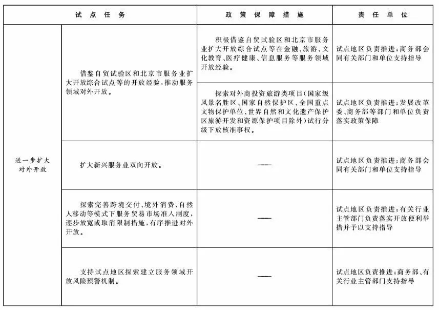 (二)进一步扩大对外开放。在试点地区分阶段推出开放便利举措。借鉴自贸试验区和北京市服务业扩大开放综合试点等的开放经验,推动服务领域对外开放。扩大新兴服务业双向开放。探索完善跨境交付、境外消费、自然人移动等模式下服务贸易市场准入制度,逐步放宽或取消限制措施,有序推进对外开放。支持试点地区探索建立服务领域开放风险预警机制。