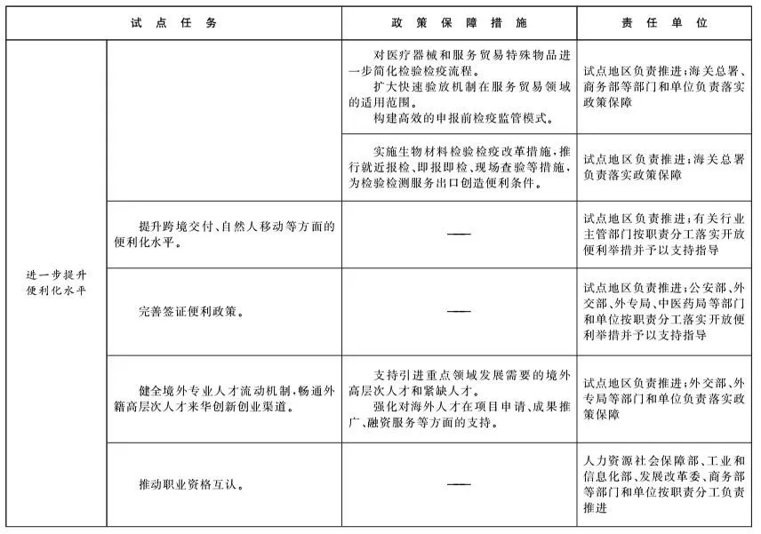 (五)进一步提升便利化水平。深入改革通关监管制度和模式,为与展览、维修、研发设计等服务贸易相关的货物、物品进出口提供通关便利。提升跨境交付、自然人移动等方面的便利化水平,完善签证便利政策,健全境外专业人才流动机制,畅通外籍高层次人才来华创新创业渠道,推动职业资格互认。提升移动支付、消费服务等方面的便利化水平,积极发展入境游。