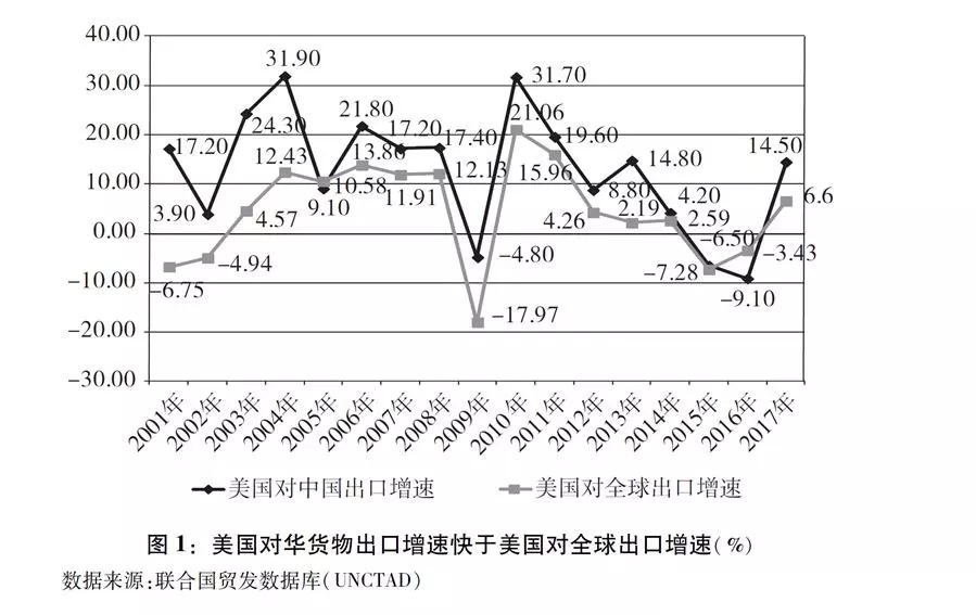 美国对华出口增速明显快于其对全球出口。中国加入世界贸易组织以来,美国对华出口快速增长,中国成为美国重要的出口市场。根据联合国统计,2017年美国对华货物出口1298.9亿美元,较2001年的191.8亿美元增长577%,远远高于同期美国对全球112%的出口增幅(图1)。