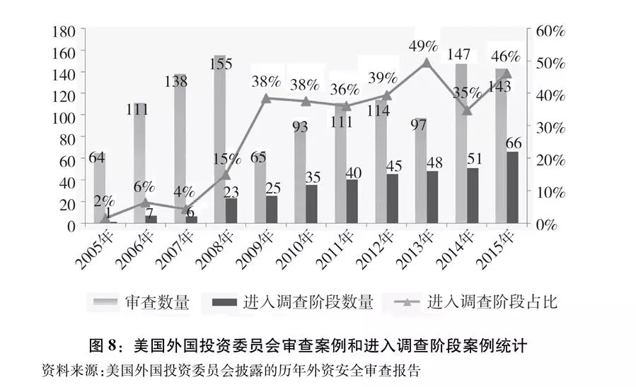 在外商投资安全审查实践中,美国“国家安全审查”的依据模糊不清,审查力度不断加大。根据美国外国投资委员会的历年外资安全审查报告,2005-2008年审查外国投资交易案例468起,其中需要进入调查阶段的案例37起,占比仅8%。但自2008年美国财政部发布《外国人合并、收购和接管规制:最终规则》以后,2009-2015年期间审查的770起案例中,需要进入调查阶段的达到310起,占比陡然提高到40%。尤其是在最新披露的2015年数据中,这一比例进一步提高到46%,处于较高水平(图8)。