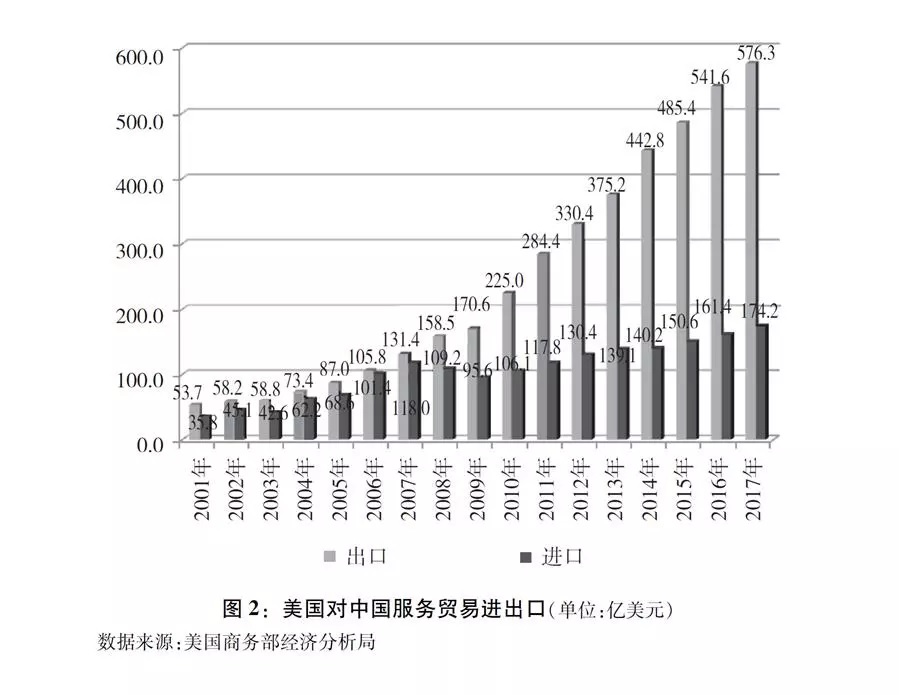美国是中国服务贸易最大逆差来源地,且逆差快速扩大。据美国方面统计,2007-2017年,美国对华服务出口额由131.4亿美元扩大到576.3亿美元,增长了3.4倍,而同期美国对世界其他国家和地区的服务出口额增长1.8倍,美国对华服务贸易年度顺差扩大30倍至402亿美元(图2)。