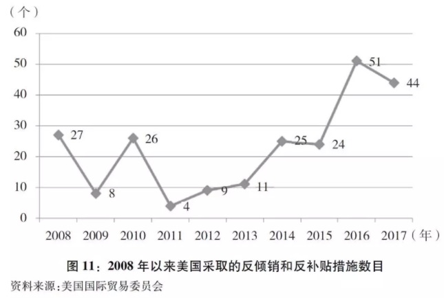 ▲ 图表:图11:2008年以来美国采取的反倾销和反补贴措施数目 新华社发