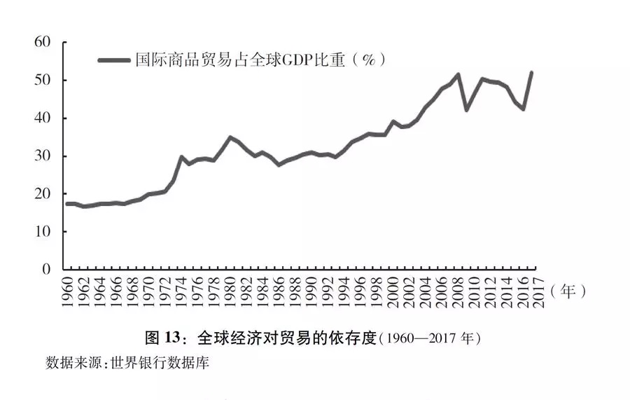 随着全球化进程发展,各国经济基于经贸关系的相互关联度越来越高,贸易已成为全球经济增长的重要动力。根据世界银行统计,全球经济对贸易增长的依存度已从1960年的17.5%上升到2017年的51.9%(图13)。