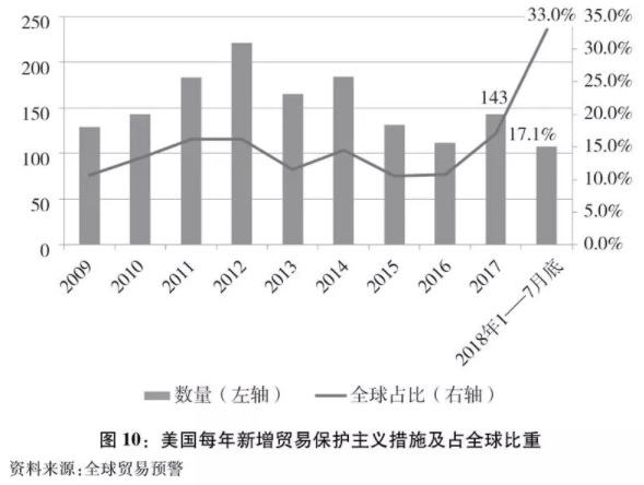 美国贸易保护主义措施增多,在全球占比不断提高。全球贸易预警(Global Trade Alert)统计数据显示,2017年,全球共有837项新的保护主义干预措施,其中美国出台143项措施,占全球总数的17.1%。2018年1-7月底,美国出台的保护主义措施占全球比重达到33%(图10)。