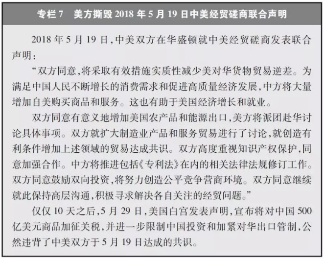 美国政府在双边经贸谈判中出尔反尔,不守承诺。中国历来高度重视维护中美关系稳定,特别是2017年以来,积极回应美国经贸关切,以极大的诚意和耐心与美国政府开展了多轮磋商,力图弥合分歧、解决问题。2018年2月下旬到3月上旬,应美国方面强烈要求,中国派团赴美举行经贸谈判。4月3日,美国公布对500亿美元中国输美产品加征25%关税的产品清单。面对美国反复无常、不断抬高要价的行为,中国本着最大限度通过对话解决问题的诚意,于5月初与来华谈判的美国代表进行了认真磋商。5月15日至19日,中国应美国要求再次派代表团赴美谈判,并在谈判中对美国诉求做了积极回应。双方在付出艰辛努力后,达成“双方不打贸易战”的共识,并于5月19日对外发表了联合声明。但是,仅仅10天之后,美国政府就公然撕毁双方刚刚达成的联合声明,背弃不打贸易战的承诺,越过世界贸易组织争端解决机制,宣布将对来自中国的产品实施大规模征税措施,单方面挑起贸易战(专栏7)。