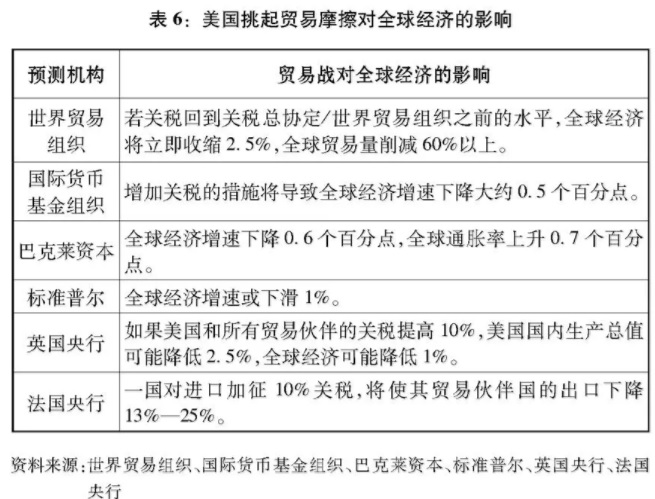 当前,全球经济刚刚走出国际金融危机的阴影,回升态势并不稳固。美国政府大范围挑起贸易摩擦,阻碍国际贸易,势必会对世界经济复苏造成负面影响。为了遏制美国的贸易保护主义行为,其他国家不得不采取反制措施,这将导致全球经贸秩序紊乱,阻碍全球经济复苏,殃及世界各国企业和居民,使全球经济落入“衰退陷阱”(表6)。