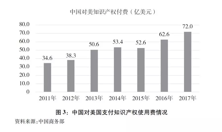 中国对美国支付知识产权使用费持续增加。据中国有关方面统计,美国是中国第一大版权引进来源国,2012-2016年,中国自美国引进版权近2.8万项。中国对美国支付的知识产权使用费从2011年的34.6亿美元增加至2017年的72亿美元,6年时间翻了一番(图3)。其中2017年中国对美支付占中国对外支付知识产权使用费总额的四分之一。