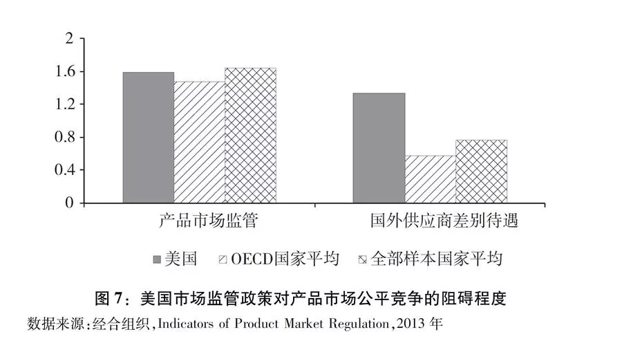 美国对他国产品的歧视程度远高于大多数发达国家,甚至也高于一些发展中国家。根据“产品市场监管指标”二级指标“国外供应商差别待遇”对35个经合组织国家进行排名,2013年美国排在第32位,表明美国产品市场对外国存在严重歧视。若包括12个非经合组织国家的指标,美国在47个国家中排名第39位,歧视程度比巴西、保加利亚、塞浦路斯、印度、印度尼西亚和罗马尼亚等非经合组织国家更高(图7)。