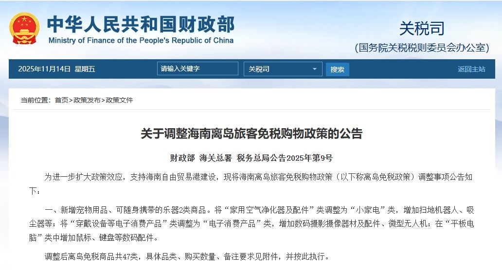 关于调整海南离岛旅客免税购物政策的公告